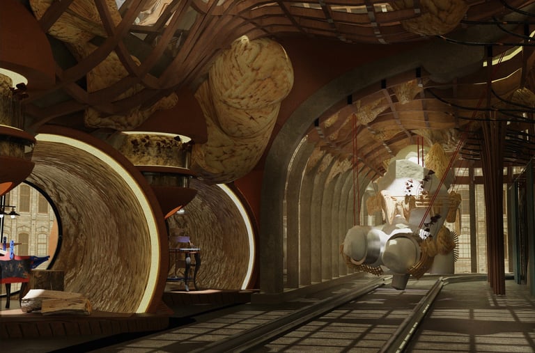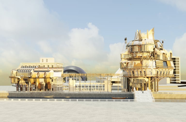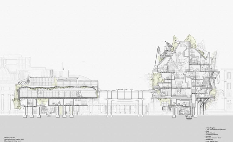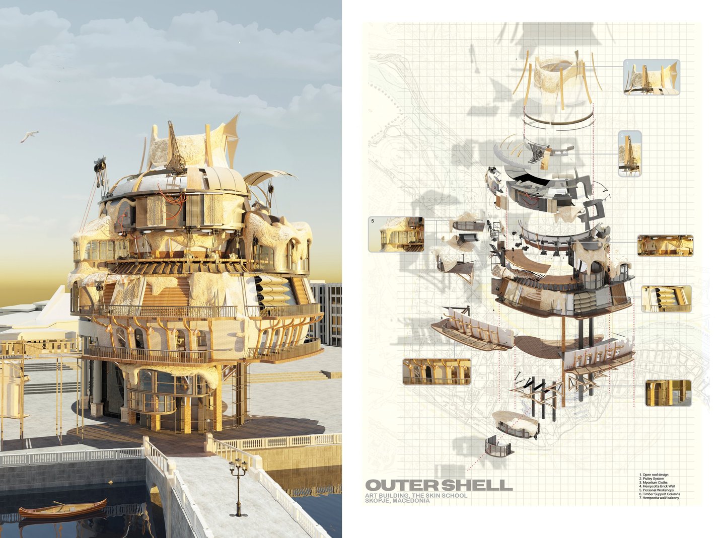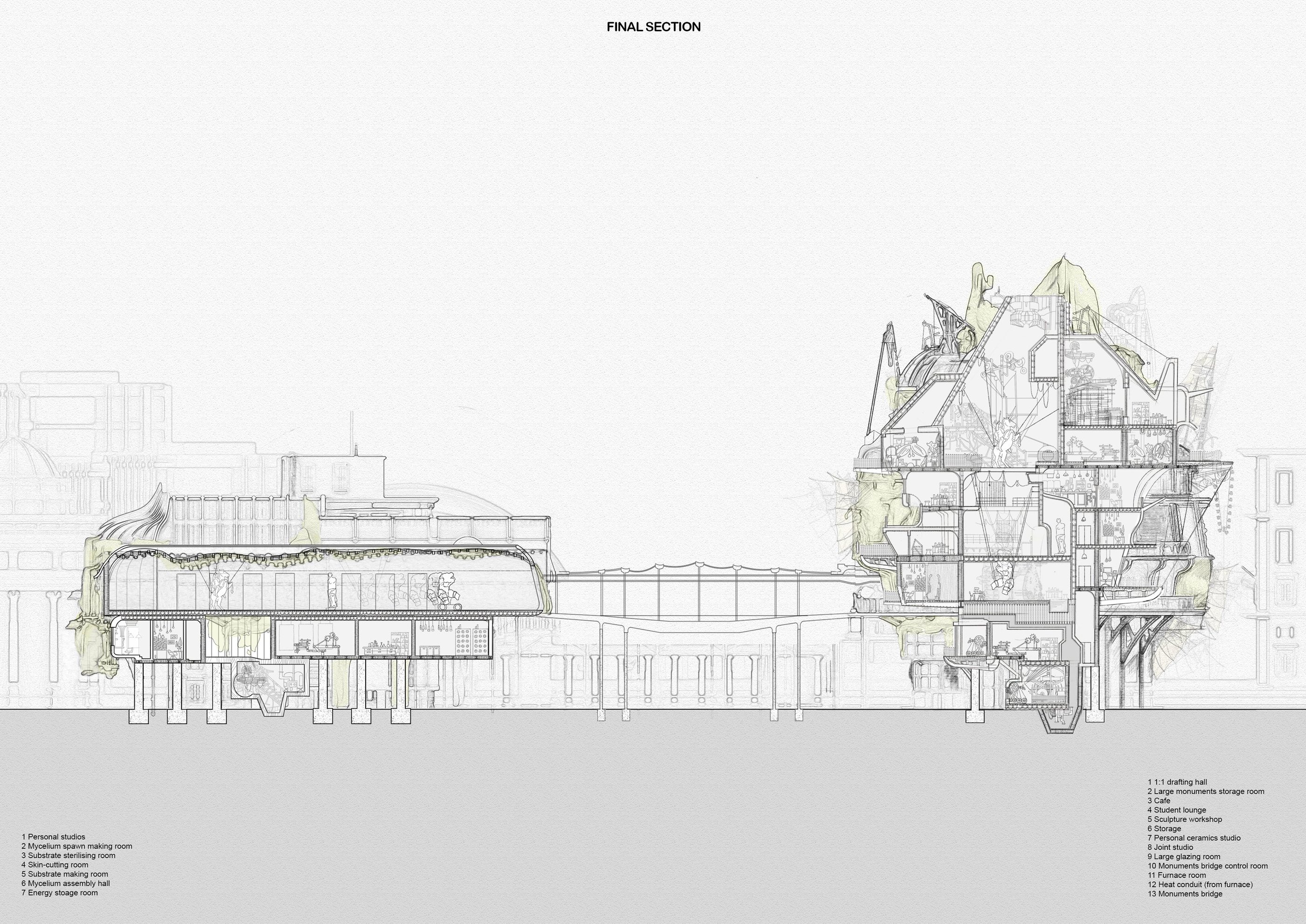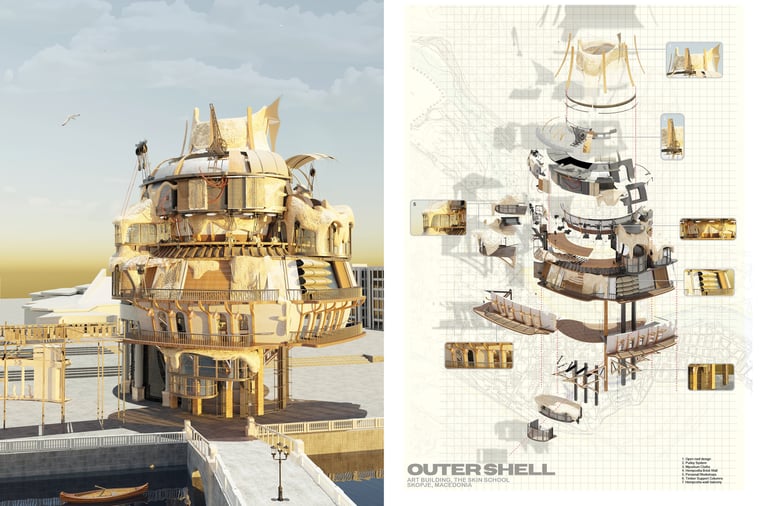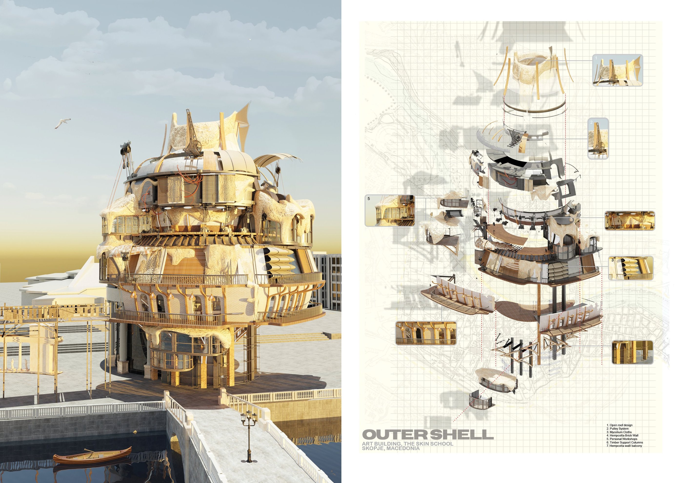 My project, titled “The Skin School” is a college for the youth that promotes the creation of “new histories”. This school offers an arts and science education where students are taught to embrace a new and alternate identity for Skopje. Students here craft transformative “skins” made of mycelium, a sustainable building material, adorned with unique ceramics creations, over existing structures from the Skopje 2014 project. The school itself is designed as an inhabitable “skin” built over current elements of the project. The college will be an evolving space where students are actively involved in its ongoing development and expansion.